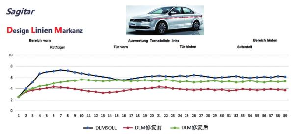 棱线型面研修工作完成后,通过大线调试生产,出试装件、测量件。冲压质保通过手摸、目视、油石连线检查单件表面质量,涂装喷漆光影检查表面状态,测量中心用三坐标测量单件尺寸。最后按照德国Audit质量评定标准,对比棱线锐度修复前后的DLM棱线锐度特征值(图8),结果显示棱线锐度修复后的数值大于修复前的数值,DLM数值越大,棱线锐度越好,本次棱线锐度修复工作完成。