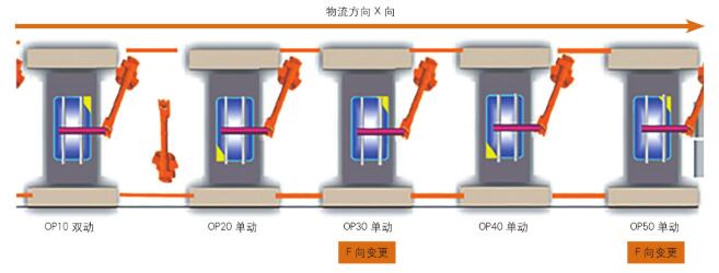根据冲压自动线机械手的不同,模具的进出料方向会有变化,这与机械手的行程旋转角度不同有关,在模具改造中需要加以考虑,改变模具原有标记,防止生产时装模方向错误。案例中自动线为五工位,首台为双动机床,所以OP10与OP20之间有工件翻转需求(绕Y轴旋转180度),所以设置两台机器人对接送料,全线配备的是6轴机器人,每台机器人进行工件传递时会绕Z轴旋转180度,那么模具改造时,OP30与OP50的模具F向需要改变,也就是原有进出料方向需打反,如图3所示。F向变更后需注意相应的电气路接头同时也需要调整到靠近机床气源和电源侧。
