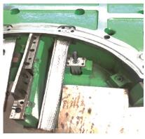 自动化线模具夹紧装置采用自动快速夹紧模式,在改造中需考虑几点:1)压板槽附近的模具空间结构需避开夹紧器最大外形尺寸,同时留有一定空间保证夹紧器自由进出不干涉;2)压板槽深度需与夹紧器夹持厚度一致;3)需加工上模夹紧器感应面,确保感应到位。在实际改造中,模具压板槽的改造很可能找不到合适的空间位置,需要铣去加强筋,加大安装空间,势必影响模具强度,这时需要根据模具的具体结构综合考虑影响的大小,增加辅助加强措施,如增加整体模具垫板等。