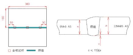 图2 焊缝剖面金相取样位置及焊缝凸起要求示意图