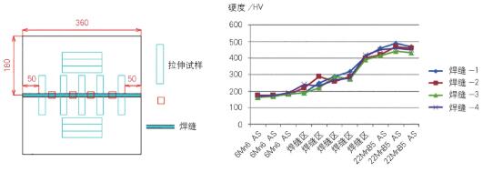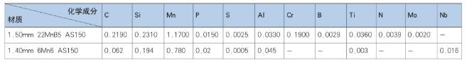 ⑵1.40mm 6Mn6 AS150区域:抗拉强度520~700MPa,屈服强度340~470MPa,延伸率A50≥17%,硬度161~215HV。取样位置如图3所示。