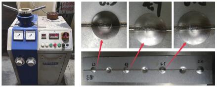 ⑴热冲压前激光拼焊板杯突测试开裂不在焊缝位置,判定合格。测试设备及结果如图4所示。
