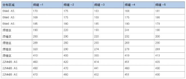 ⑶从焊缝位置取金相试样测两侧基板硬度值均合格,数值较首次结果有上升。从包含焊缝区域位置硬度值分布趋势图看,硬度由软区向硬区呈逐步上升过渡趋势。具体如图8、表7所示。