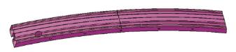 如图4所示,该零件需要切割两个大孔及两个端头,孔及端头采用模具冲裁时会产生变形,因此为保证零件质量,采用激光切割的方式来避免零件变形。该零件孔的切割是比较容易实现的,但是型材的端头切割加工就会有难度,该型材截面为B字形状,切割方向360度每个方向都有,所以就要求激光切割头可以360度旋转,并且要有足够的空间可以让切割头旋转,如果法线方向上空间不够,那么在不影响零件使用的情况下,可以采用小的带角度切割,因此切割头的切割轨迹的设置需要不断的进行尝试,最终保证零件质量,同时降低制件成本,提高生产效率。