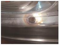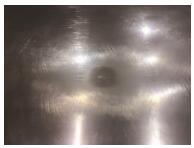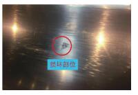 ⑴损坏情况。生产过程中模具垫异物损坏,损坏深度约0.2mm,损坏区域直径约为10mm,如图6所示。