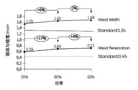 比较以上三种功率下的激光焊质量,熔深与熔宽随功率的变化曲线如图4所示,从结果看:⑴功率越大,熔深与熔宽越大,但功率从60%到65%时,熔深与熔宽的增大率小于5%。⑵随着功率的增大,有背透的风险,在功率为65%时,出现背透。因此样片测试结果显示功率选择在最大功率的60%时相对较优。