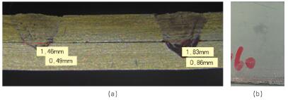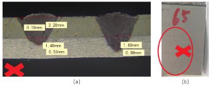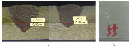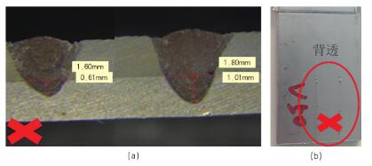 图1所示是在功率为55%,焊接速度为60mm/s时的结果,其中图1(a)为焊缝的金相照片,图1(b)为激光焊接完成后背部的照片。从结果来看:在该焊接参数下,焊缝的熔深一条为0.37mm,一条为0.80mm,而公司要求的最小熔深为0.45mm,则0.37mm这条焊缝不合格;两条焊缝的熔宽分别为1.71mm和1.40mm,均满足公司要求的最小熔宽1.35mm,但1.40mm处于达标的边缘。并且从图1(b)可以看出,无背透现象。