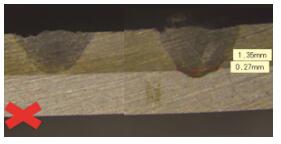 图5所示是在功率为60%,焊接速度为70mm/s时焊缝的金相照片。从结果来看:该焊接参数下,焊缝熔深为0mm和0.27mm,均不能达到公司的要求,熔宽为0mm和1.35mm,其中一条无法满足公司的标准要求,另一条是刚刚达到公司的要求,因此在该参数下,无法满足公司的激光焊质量要求。