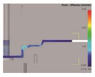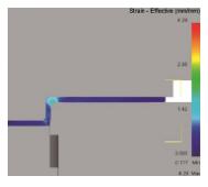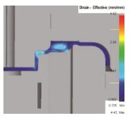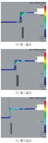 为解决成形方案中凸台圆角处充填不饱满的问题,考虑在成形凸台之前增加一道次,在内筒与轮辐之间作圆弧过渡,使坯料在凸台处聚料,后两道次按照成形方案的模具进行模拟。增加在凸台处聚料的道次及成形凸台最后一道次的应变分布图如图8、图9所示。从成形结果看,凸台圆角处充填饱满,并且没有缺陷产生,成形效果较好,故该成形方案可以有效地解决凸台处减薄严重的问题。对比各道次等效应变值可以发现,随着道次的增加,材料内累积的应变值越来越大。