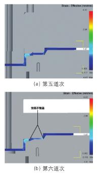 第五道次冲压预成形凸台以及轮辐与内筒相接的圆角,第六道次通过局部加载凸台处的上模具将凸台锻造至零件要求壁厚。通过锻造工艺使凸台处近净成形,减少机加工量;同时使金属材料向四周圆角处流动充填,提高产品表面光洁度和产品精度;并且可以改变金属组织,提高金属性能。第五道次至第六道次等效应变分布图如图7所示。成形过程中没有出现刮料、折叠等缺陷,但是从图7(b)可见凸台圆角处未充填饱满,这是由于凸台高度较高,冲压过程中减薄较严重引起的。