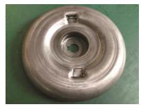 根据模拟分析结果,利用YQK-200型液压机进行试验,得到了合格的样件,多楔带轮锻压试件如图12所示。可以看出凸台部分成形质量较好,试件表面光洁度较高,未出现刮料、叠料等现象,经测量试件各关键部位处壁厚均达到后续加工要求。通过试验验证了该锻压工艺的正确性,可为实际生产提供指导。