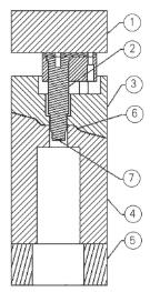 如图1所示,图中模具由上模座-1,冲翻孔结构-2,压料芯-3,翻孔凹模-4,下模本体-5,钣件-6,冲孔废料-7组成。