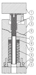 1-上模本体 2-冲翻组件 3-压料芯 4-翻孔凹模 5-下模本体 6-制件成形区域 7-冲孔废料 8-浮动顶料器 9-弹簧 10-弹簧盖板