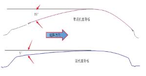 将节拍调至7.7件/分钟,生产机盖外板面品及精度良好。当采用8.3件/分钟的节拍生产机盖外板时就不同程度的出现单件面品及翻边高度超差的现象,自动化轨迹优化后只会对生产稳定性更有利。审查CHB025A机盖外板工艺排布发现OP10为拉延,OP20为机盖左右两侧侧修,前保和前风挡侧为正修及二级切刀形式,OP30为在前风挡侧两个φ16mm定位销的前提下周全正翻,OP40为机盖外板四角继续侧翻。常规机盖外板为了减少生产过程中料渣铬伤制件的问题,采用在送料的前后侧设置二级废料刀工艺,此时在送料方向上不会布置废料刀,而是在机盖左右两侧近送料方向的部位设置2把切断废料刀。由于机盖左右侧和前保侧均设置了废料刀,可以采用废料刀符型面来对制件进行定位,但是前风挡侧没有废料刀,此时会根据制件造型而定,是否制件存在生产效率提升而导致的制件失稳现象。一般机盖外板造型(在送料方向上截面图如图2所示)弧度与送料方向有个15°左右的角度,就算前风挡侧没有废料刀,也足以保证制件在高节拍的生产效率下不会出现制件向送料侧偏置的情况。但是CHB025A机盖外板弧度较平,仅有5°,在生产节拍提高后,就出现了不同程度的制件窜动的现象,导致成品件出现面品缺陷及制件翻边高度超差的问题。