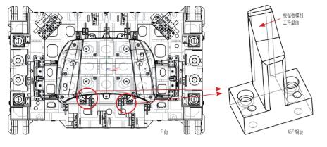 ⑶直接改造OP20模具,在机盖外板下模座前风挡侧追加定位符型块,用于防止制件前倾或生产过程中发生窜动。此方案适用于设计前期,同样也适用于模具后期,适用于中大批量车型,制造成本低,整改周期短。