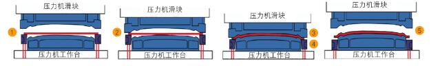 在拉延压力机冲压过程中,数控液压垫可选择最优方式控制力与位置,实现更优的拉延零件效果,避免由于拉延力过小出现零件起皱,拉延力过大出现零件开裂现象,其工序图如图2所示。