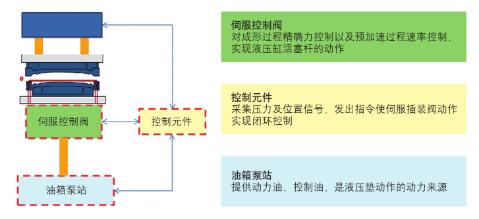 如图3所示,数控液压垫主要由伺服控制阀、控制元件、油箱泵站构成;控制元件进行采集信号及发出指令,实现整个系统的闭环控制。