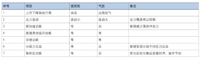 气垫主要由气罐、气缸、进气阀、进气控制阀等组成,无提前预加速功能及取料位功能、压力分段功能,相对数控液压垫来说有一定局限性,如对复杂零件进行拉延时,难于对零件品质进行控制。