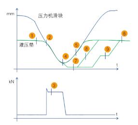 滑块冲压下行,在①处如选用了预加速功能,液压垫会提前运动,运动到②位置时滑块追上液压垫,从液压垫位置控制转换到力控制。如未选用预加速功能,滑块运动到②位置冲击静止的液压垫,该动作与气垫动作类似。