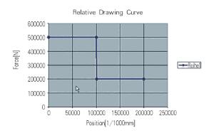 压力机拉延过程②→④可根据零件产品需求的压边力设定分段拉延,能够有效的实现复杂零件拉延工艺,其中压边力不能跳变,需要一定的过程转换。如采用两段拉延力,分别为:1)0~100mm:500kN,2)100~200mm:200kN,如图8所示。