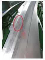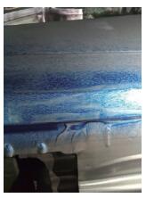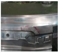 接下来检查凸模与制件服贴度,发现凸模与制件服贴度不好,有0.3mm 间隙。尝试调试拉延序走料量,减小制件回弹,但间隙无法彻底消除,仍有0.2mm间隙。压件验证,缺陷虽减轻,但不是很明显。于是对凸模进行烧焊研修,如图4 所示,消除间隙后压件,缺陷明显改善,但还判定为C1 类缺陷。