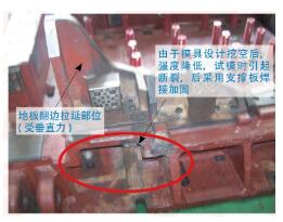 图1、图2 所示为左右地板模具因设计不合理而造成试模时模具断裂,因此模具设计师一定要对车身地板翻边受力部位进行受力计算,在模具设计完成后,工程技术人员要进行CAE 分析评审,方可避免此类问题的发生。