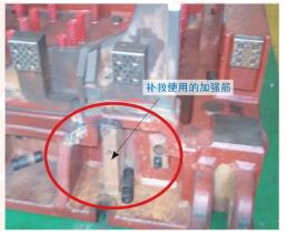 图6 所示模具只有两个工作销,属于安全销设计漏项,该问题产生的主要原因是技术评审没有严格把关。按照模具设计要求,设计师设计完毕后,图纸要进入校对、标准化、审核、批准流程,加工前要有工艺部门进行会签审核,会签后方可进入加工程序。
