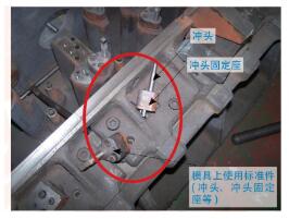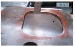 一般冲压废料深度在两个板料厚度范围内(图13),在模具静态验收中,若冲头垫垫得低,易造成板料冲孔毛刺;若冲头垫垫得高,使得废料下陷深度加大(甚至高达12mm),易造成冲头磨损或折断。