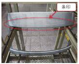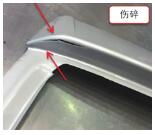 朗行后盖外板在批量生产中常出现条状表面瘪塘,对屈强比等材料性能参数敏感度高,零件缺陷表面状态如图1所示。批量生产零件表面状态不稳定,停机率可达50%,生产报废率可达30%,并且需要工艺全返工,严重影响生产节拍。同时伴随着生产数量增加,模具温度升高,拉延状态发生变化,零件在高位刹车灯等多处位置产生伤碎,零件状态如图2所示。因此有必要对零件的成形工艺进行分析,确定零件表面条状瘪塘及伤碎的成因并给出具体的优化方案。这不仅能优化零件的表面状态,提高零件的品质,对提高生产率,降低报废及返工等方面的成本,也有重要意义。