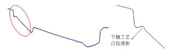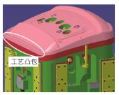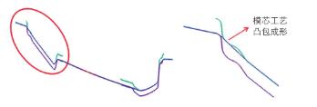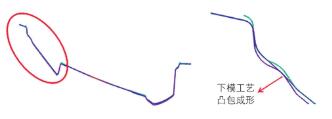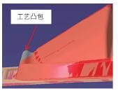 ⑴两厢后盖外板上平面区域拉延较深,工艺凸包的存在会增大料片拉延伤碎的风险,工艺设计中上下模大平面区域应尽量避免工艺凸包的设置。工艺设置大平面区域包模芯拉延成形,有利于料片流动与受力均匀。