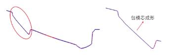通过AutoForm对OP20拉延成形过程进行模拟分析。上模下行过程,压边圈压料后,模芯开始与料片接触,在模芯作用下零件大平面区域开始拉深成形,如图7所示。由于模芯工艺凸包的存在,凸包高点提前接触料片,使得大平面不能完全包模芯成形,上模距离下死点25mm,5mm时的成形状态,如图8、图9所示。上模从距离下死点5mm至运动到位的过程,下模工艺凸包进一步拉延成形,如图10所示。