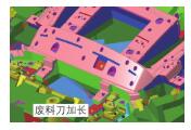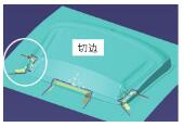 考虑OP20拉延模工艺凸包取消及拉延筋加强等因素,料片向模具内流动量减小,分模线外侧废料变大,后续切边工序存在废料切不断的风险,影响废料正常脱落。需要对后盖外板切边模大平面侧废料刀进行优化,废料刀需加长,如图18所示。