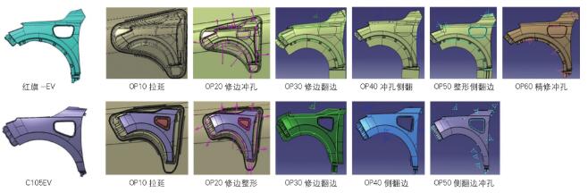 产品充电口如果按传统工艺,OP10拉延工序会将充电口填充,通过OP20预修边、OP50翻边整形、OP60精修边三道工艺内容,其中要避开OP30发罩搭接侧的斜楔整形工序及OP40与门搭接侧的斜楔整形工序,所以带充电口的翼子板需要六工序。