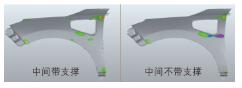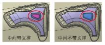 针对充电口拉延工艺型面,从图2中的两种方式对比分析可以看出,充电口中间工艺补充面撑起的状态在材料成形过程中,板料型面始终贴紧凸模型面,充电口周圈成形时保证凸模型面周围板料撑紧,成形稳定;而充电口中间没有支撑的工艺补充面成形过程中产生了板料凹陷,充电口周圈成形时只有一侧板料服贴,成形状态不稳定,如图3所示。根据模拟分析后油石检查效果(图4)也可看出,充电口中间撑起的工艺补充面品质量更好,故选定了充电口中间撑起的工艺补充形状。