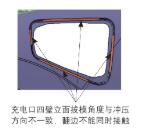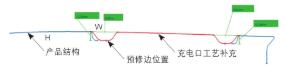 充电口距轮眉棱线过近,易产生轮眉棱线滑移及充电口A面波浪,建议充电口到轮眉的距离>30 mm。建议充电口到门缝轮廓的距离≥60mm,避免拉楔整形结构镶块强度过于薄弱(图11),产品有了很大的改善。