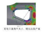 通过全工序模拟分析后, 产品最小回转半径R为23.32mm,充电口四角会产生严重的面品缺陷(图8),建议充电口回转半径R>40mm,对产品进行改善。