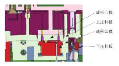 翼子板常规的六序生产,充电口处的翻边整形工序周圈是有上压料板强压控制的,内有下压料板夹料翻边整形,相对面品质量较好,翻边整形结构如图12所示。