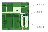 翼子板五序生产,充电口处的OP10预成形工序,拉延结构如图13所示。如何保证板料成形过程中材料均匀流动受控,而不是自由成形,这对充电口的工艺补充有较高的要求,充电口的工艺补充变化会给充电口周边的面品质量带来很大影响。