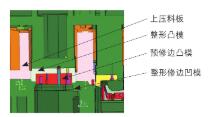 充电口拉延预成形后,由于整形量较大需要进行预修边及充电口整形,正常需要两工序完成,为了实现翼子板五工序生产,此处进行了工艺优化,将预修边及整形工艺复合在一道工序。