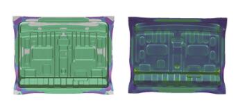 行李厢隔板(图3),在起初的设计中,材质为DC04/0.65mm。通过AutoForm仿真分析,利用DC03/0.65mm的材质进行替换分析,其最大减薄率为18%,无开裂的风险,满足零件成形分析要求的安全裕度,该零件可由DC04/0.65mm替换为DC03/0.65mm。该零件的材料利用率为63.09%,消耗定额(毛坯重量)为4.55kg。按照市场参考价格DC04与DC03每吨差价200元。那么通过降牌号的方案,该零件单车节省的材料成本=消耗定额×0.2元/kg=0.9元/台。如果按照年产10万辆计算,每年可节约材料费9万。