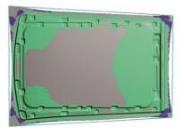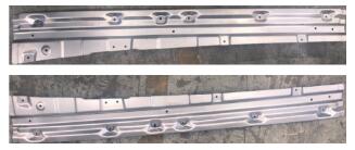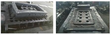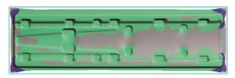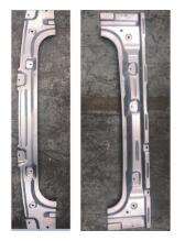 通过对图12天窗安装板分件后的制件进行分析,制件采用方料成形,具体见图13制件成形分析图,天窗安装板分件上/下段实物单件如图14所示。