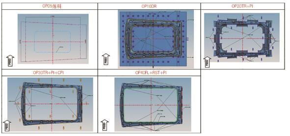 由于天窗安装板产品特点,制件两头尺寸不一样大,针对该类的制件在拉延成形时可以采用梯形料,图3为具体制件成形分析图;具体材料的排样图如图4所示;整体式天窗安装板开发冲压工序图如图5所示;整体式天窗安装板现场模具实物如图6所示。