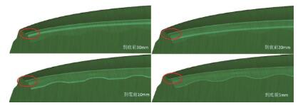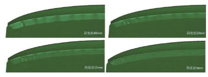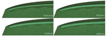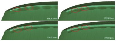 由于工序数限制,除去拉延及修边工序,此翻边必须在两序以内完成成形,由于造型原因,此翻边棱线内弯弧度较大,属于典型的多料翻边。如果采用直接自由翻边到底的工艺方案,多料现象会很严重,通过AutoForm软件模拟过程如图3所示,4张图分别展示了到底前40mm、25mm、15mm、5mm的模拟状态,模拟验证后发现翻边过程中起皱现象十分严重,并且褶皱已延伸到棱线上,已经影响到产品与尾灯的搭接棱线R角,这是不能接受的,现场会导致R角硬化,最终导致棱线R角质量不良,与尾灯搭接视觉效果不佳,因此证明自由翻边工艺方案失败。