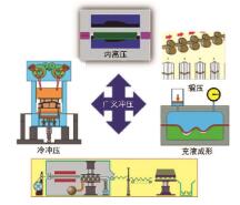 冷冲压即通过安装在压力机上的模具对板料施加外力,使之产生塑性变形或分离,从而获得一定尺寸、形状和性能的零件加工方法。但随着工艺技术的发展,冲压的概念正在逐步扩展,涉及范围也越来越广,如热成形、管材液压成形、板材充液成形、辊压成形、超塑性成形等,如图1所示。