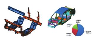 ⑸高强钢应用。国外乘用车的高强钢应用比例平均达到80%左右,商用车高强钢应用比例也在攀升。受轻量化和碰撞性能要求,国内乘用车车身高强钢应用也有大幅提升,某国产乘用车高强钢应用比例达到59%,590MPa级别冷成形钢成为标配。国内商用车驾驶室为满足碰撞和顶压要求,也开始逐步采用590MPa级别冷成形钢。随着法规的日趋严格,高强钢在商用车驾驶室上的应用会越来越广,具体应用案例如图5所示。