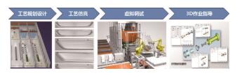 ⑶生产工艺数字化。国外数字化仿真技术相对成熟,国内近年来也开始打造建立3D数据共享重用的工艺工作环境,搭建全三维的数字化虚拟工厂(图7),实现三维环境下的工艺设计、仿真、虚拟调试等功能,从根本上提升质量、缩短周期、降低成本。