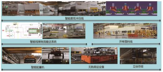 冲压设备的智能化是目前各设备供应商都在努力突破的方向。除了提升设备自动化能力外,随着传感器和控制器的广泛应用,设备变得更加智能,一些数据采集和分析软件也集成到设备里,提升设备自身感知分析判断能力,内置数据统计显示模块,实现人机交互、设备间交互。目前设备自动化、信息收集统计、预防性维护和远程控制等功能已经实现,并向更广泛的应用拓展。出现了智能冲压生产线、智能天车、智能AGV物流运输设备、智能检测设备、智能存储等适应未来个性化产品的柔性智能生产单元,如图3所示。