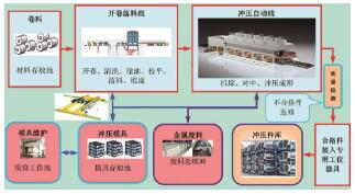 为了大批量流水作业生产,提高生产效率和自动化水平,传统单一工艺逐渐向多种工艺集成发展。如:汽车毛坯集成生产工艺,融合了开卷、校平、焊接、激光切割、压机落料等,如图1所示;高强度钢板冲压热成形工艺,融合了热处理、压力成形、表面处理、激光切割等技术,如图2所示。对模具工装也在集成研究,实现单一模具可生产两件、三件、四件或套冲等复合工艺。