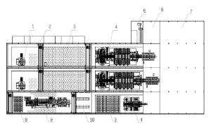 1-机模修区 2-智能管控中心 3-模具存放区 4-冲压生产区 5-废料处理区 6-冲压件返修区 7-冲压件存放区 8-材料存放区 9-毛坯生产区 10-毛坯存放区