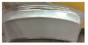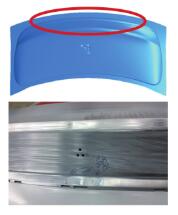 ⑶控制压边力的合理分布,不均匀程度尽量减小。制件连续拉深成形时,由于凸凹模表面与板料表面制件摩擦生热,模具零件内部热量积累使得凸凹模间隙减小,导致在压边力不变的情况下板料流动阻力发生变化,从而影响批量生产的稳定性。针对这一问题采取压边圈与凹模间隙稍大于板料厚度的措施,拉深时主要依靠拉延筋阻力控制板料的流动,避免依靠压边圈与凹模对板料的摩擦阻力的方法,使得板料流动阻力在外部条件发生变化时能够保持相对的恒定,提高拉深模批量生产的稳定性。具体措施是研修局部拉延筋槽R角,使筋槽R角均匀,过渡平顺;检查压边圈压料面着色(图7),将硬点去除,调整平衡块,使平衡块着色均匀,在序列化生产过程中,模具表面生热后,间隙稳定,摩擦力稳定,从而得到状态稳定的制件;模具修理后,经过多个生产批次验证,仍会出现起皱或开裂(图8)等缺陷,反映在模具上表现为成形裕度不足。